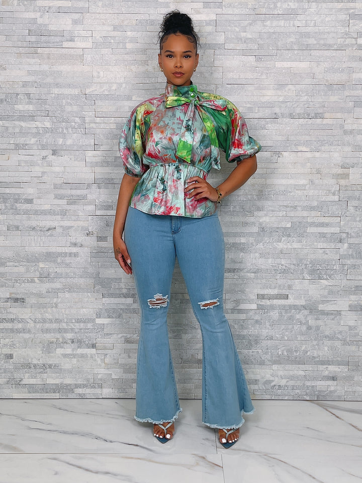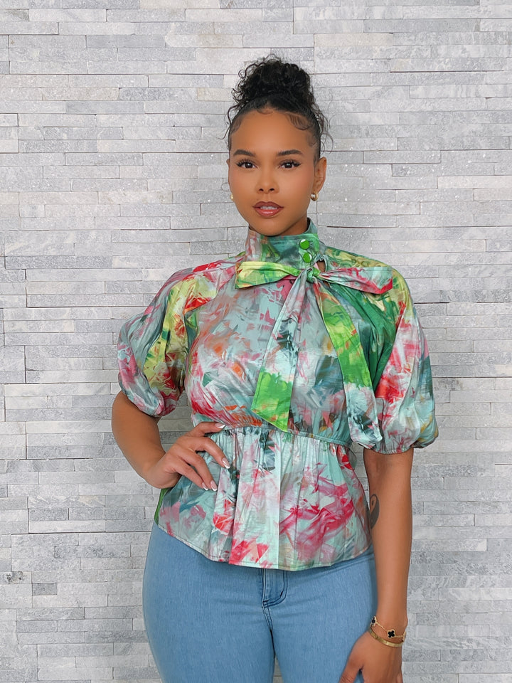 “Step into effortless elegance with this printed taffeta peplum top, a perfect blend of structure and grace. The lustrous taffeta fabric showcases a delicate floral motif, while the tailored peplum silhouette highlights your waist for a flattering finish. Designed to add sophistication to any ensemble, this top transitions seamlessly from day to night—pair it with trousers for work or a skirt for a night