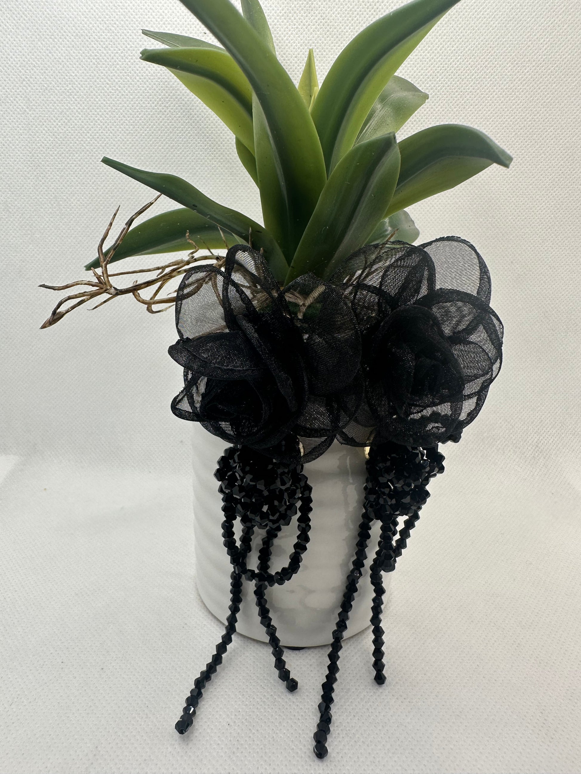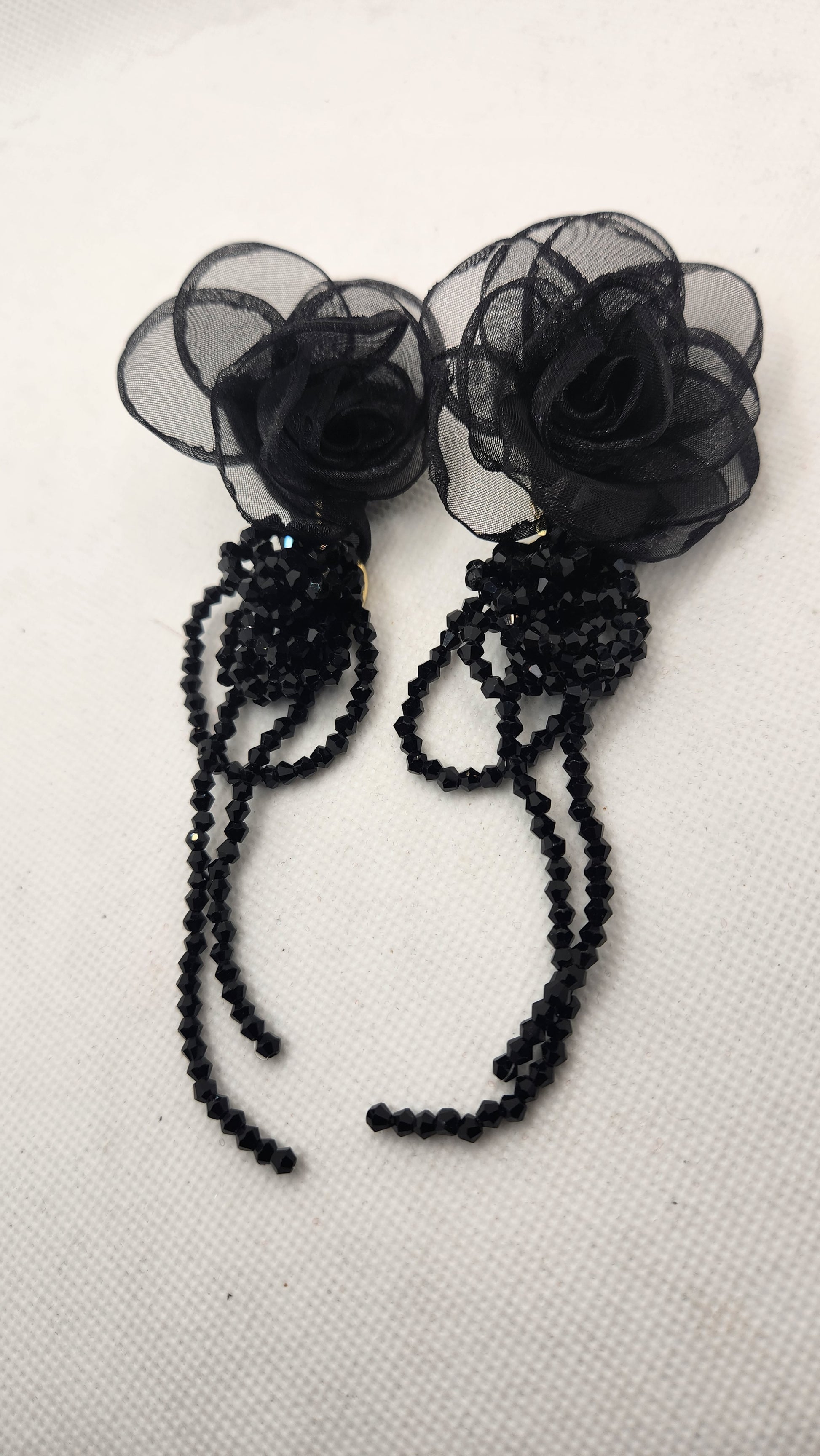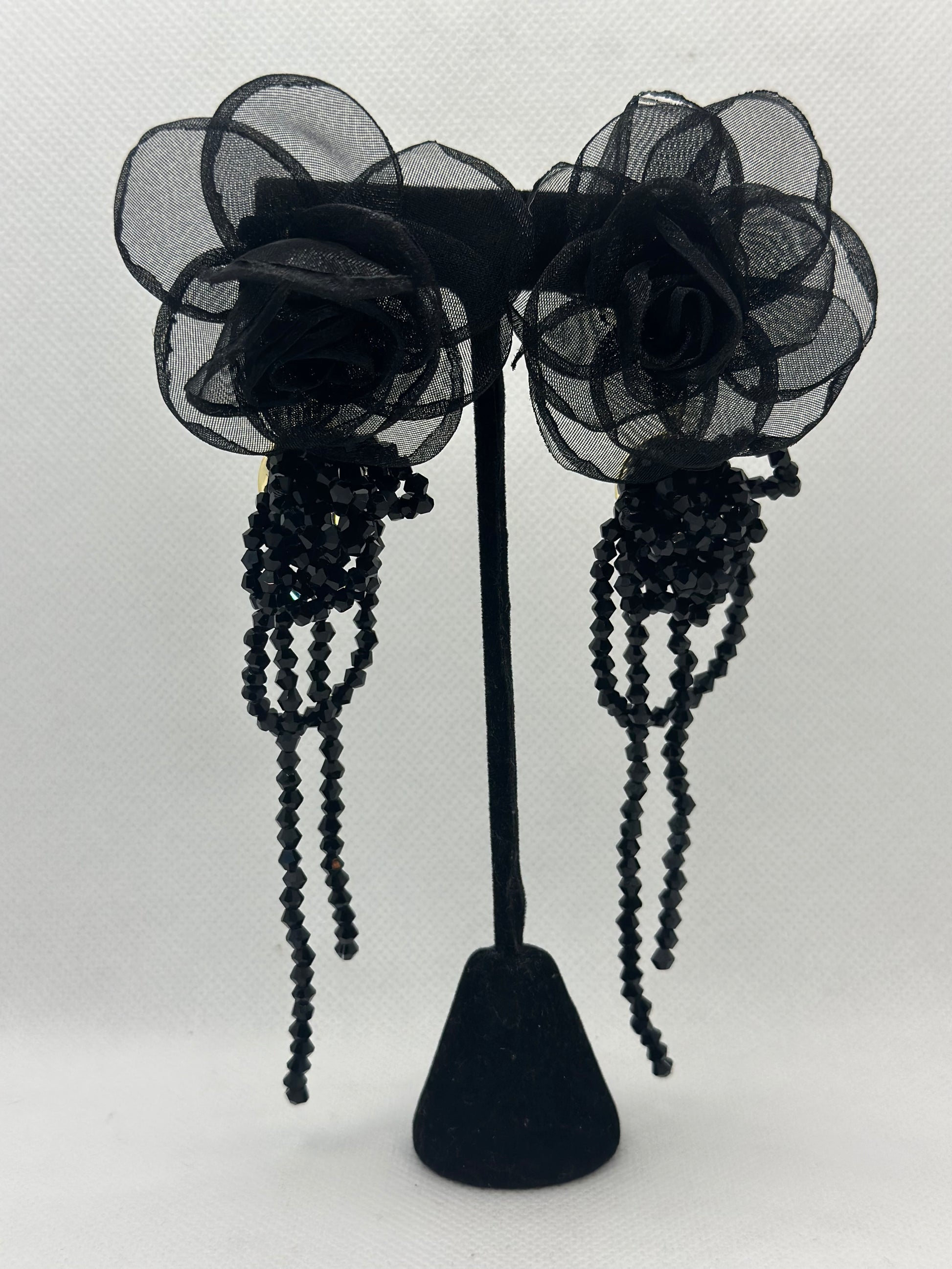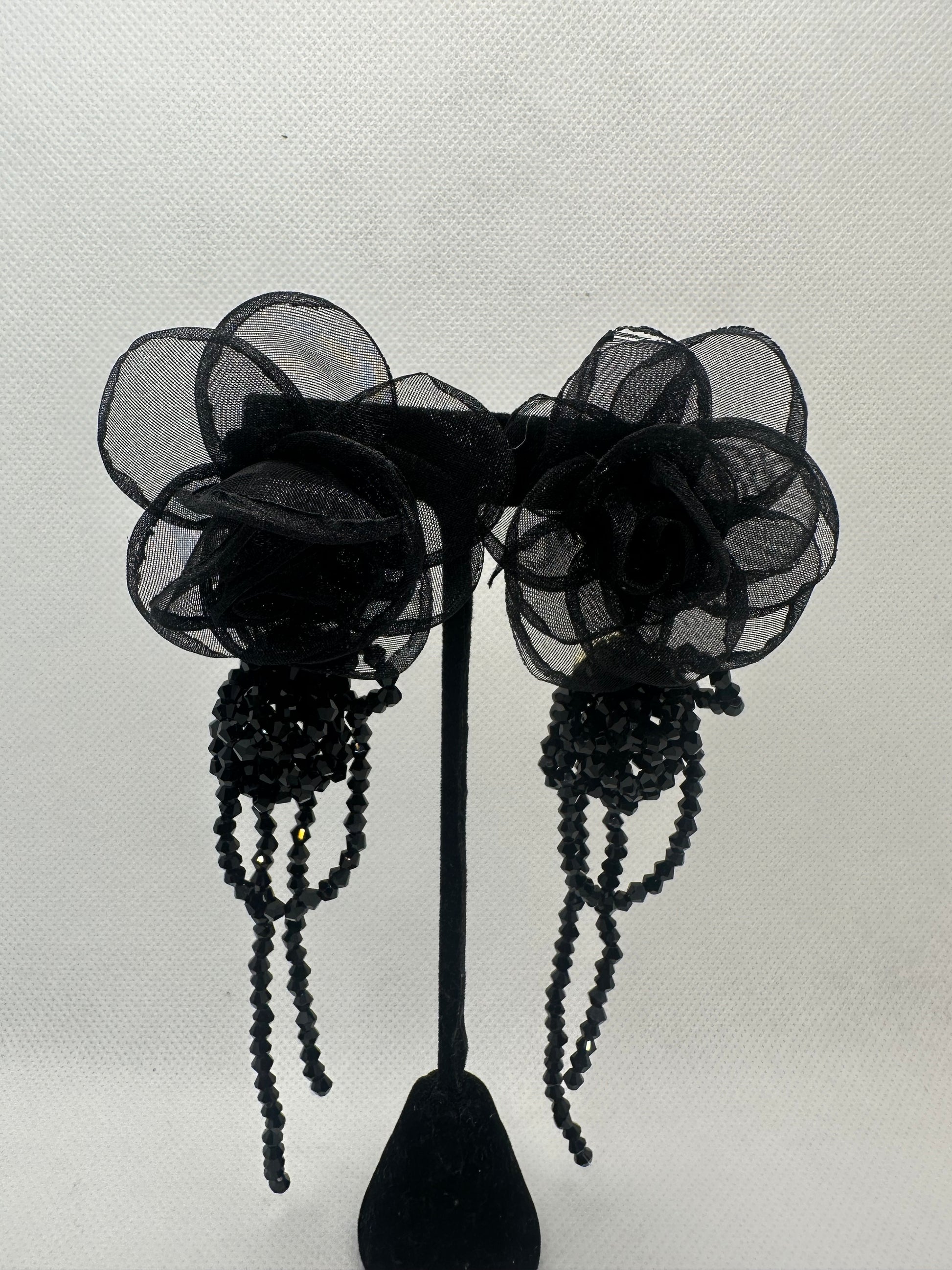 Black mesh design with intricate bead detail.