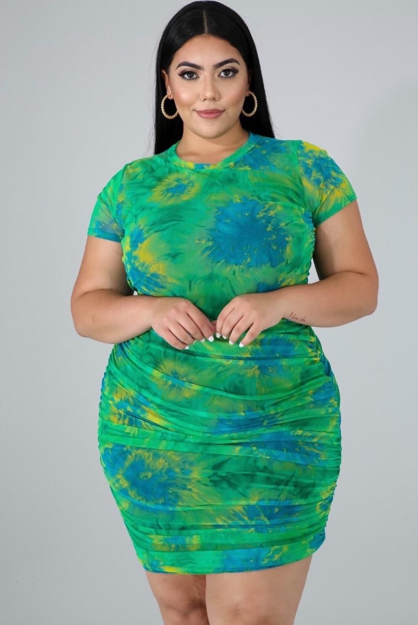 Beautiful green and blue ruched dressed. Ruching accentuates and covers the tummy area.