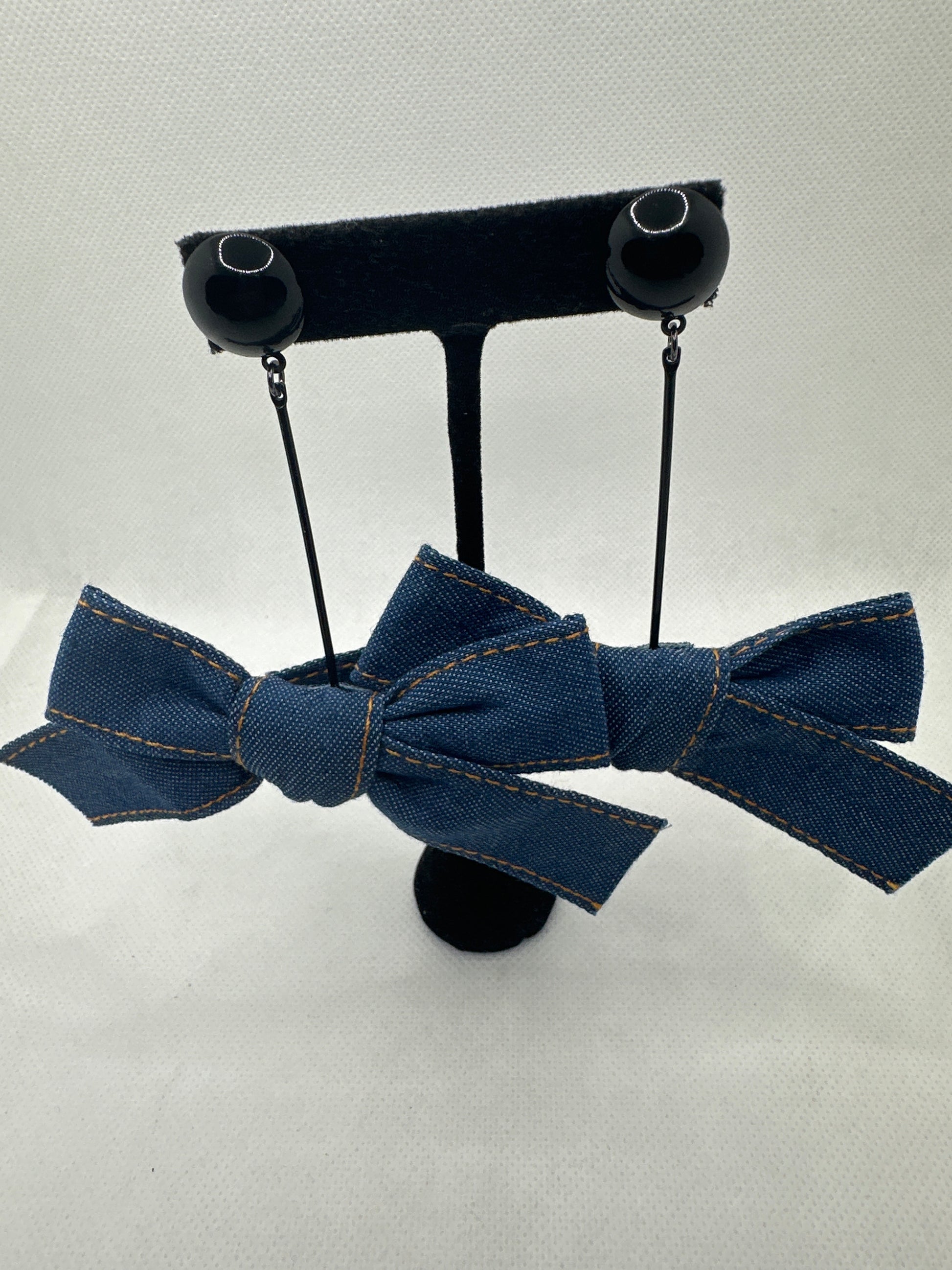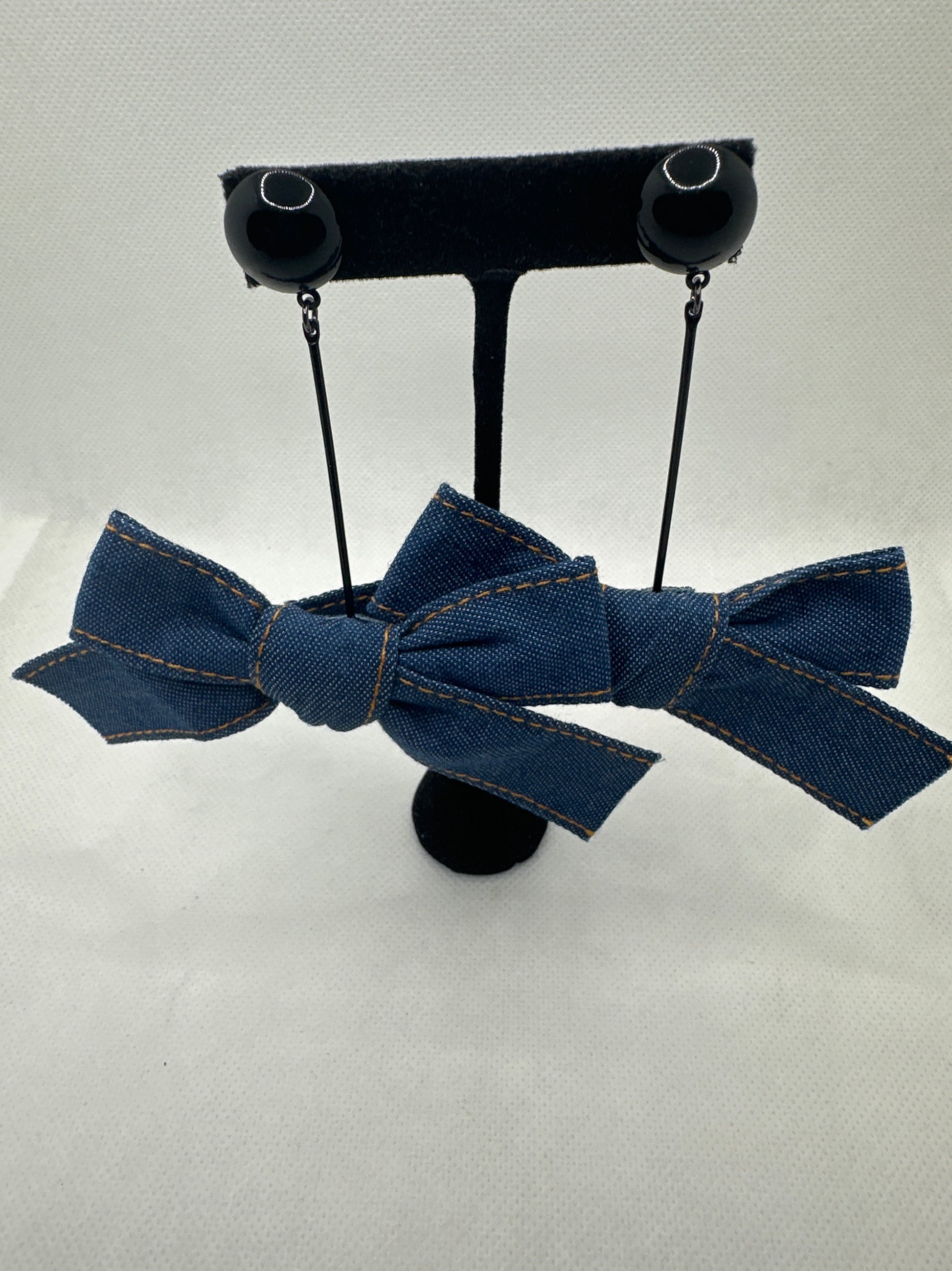These Denim drop bow earrings are a stylish and fashionable accessory that can be paired with many different types of outfits. These earrings typically feature a denim bow that hangs down from a black metal on a post. The denim material adds a touch of casualness to the piece, while the bow shape is both whimsical and elegant.