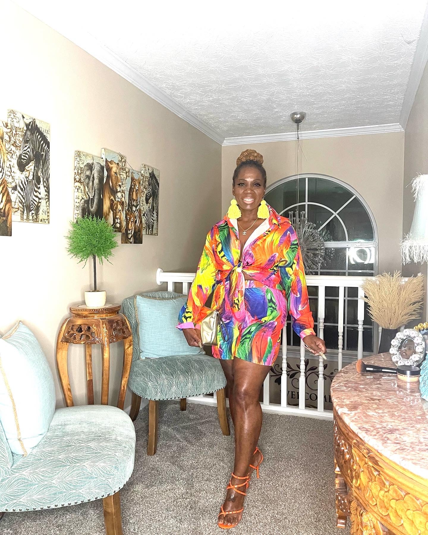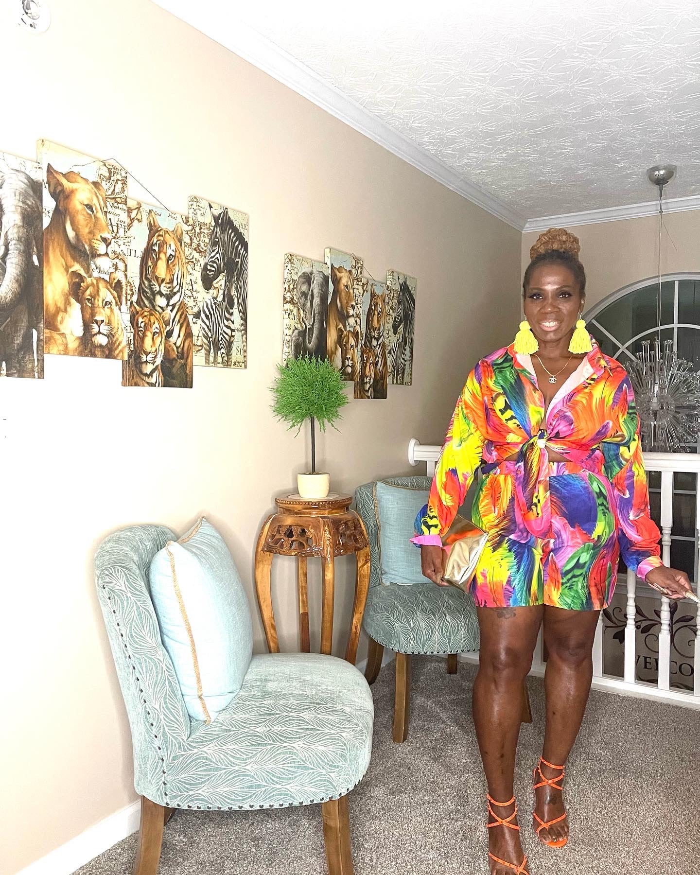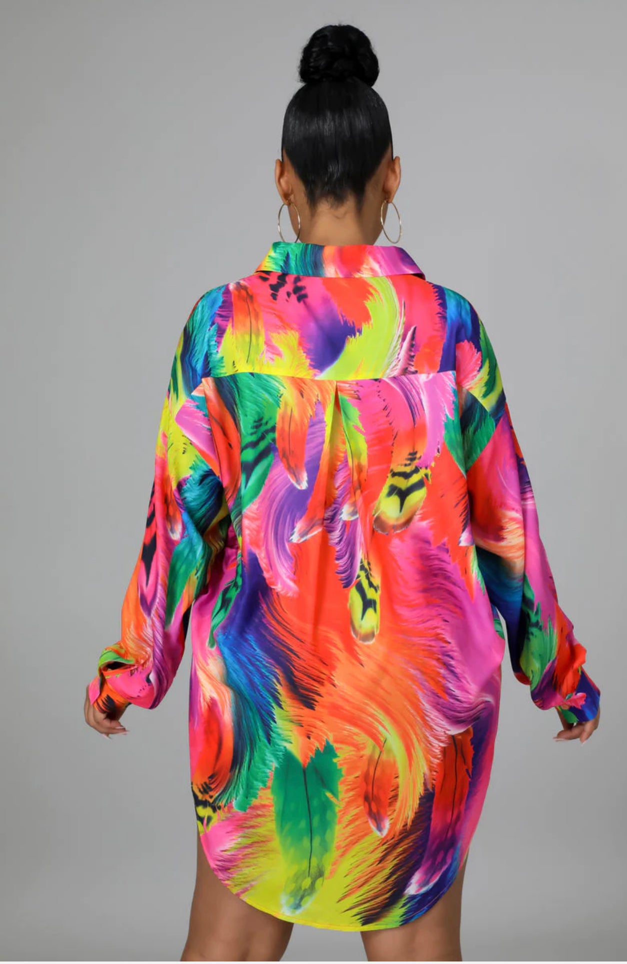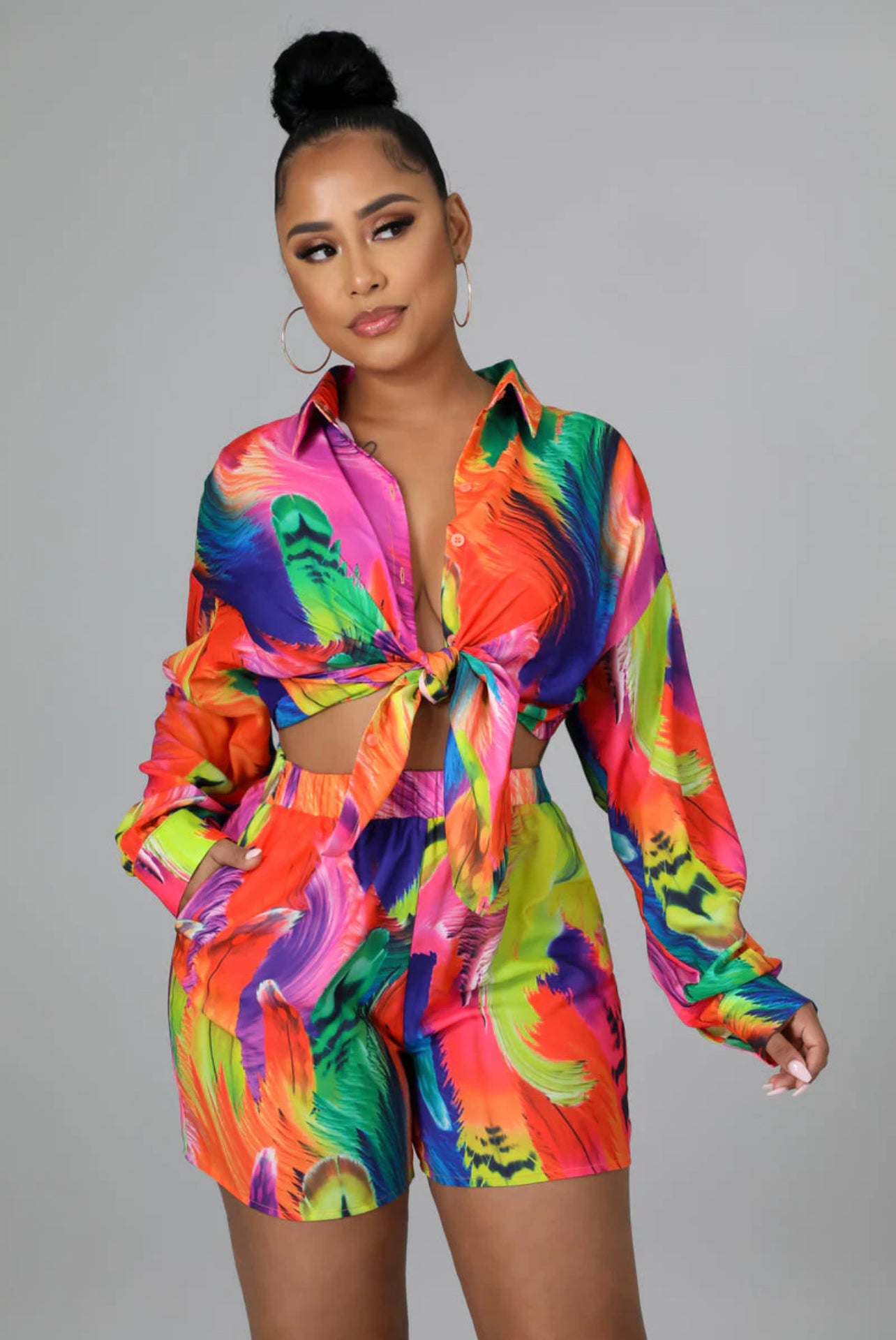Oversized button up top with matching shorts. Shorts have stretchy elastic waist & 2 side pockets set has no stretch 100% polyester.