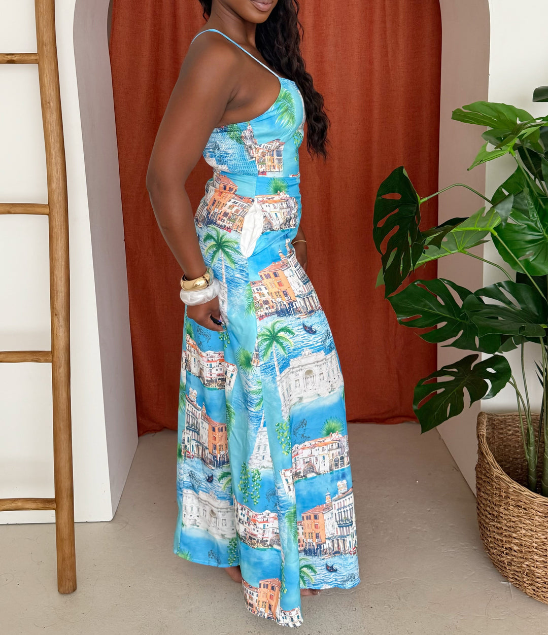 Escape to paradise in the Island Dreams Maxi Dress, a breathtaking piece that captures the beauty of a coastal cityscape in every step. Featuring a stunning, scenic print of charming buildings, palm trees, and waterfront views in vibrant blue and tropical tones — this dress is your passport to effortless elegance.