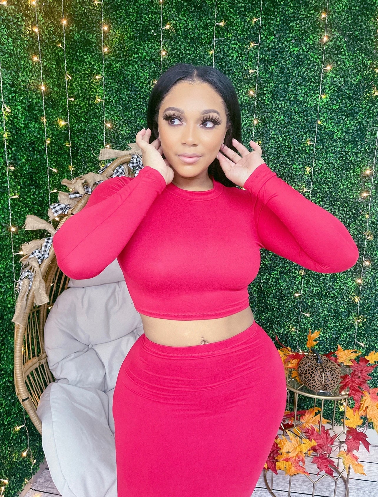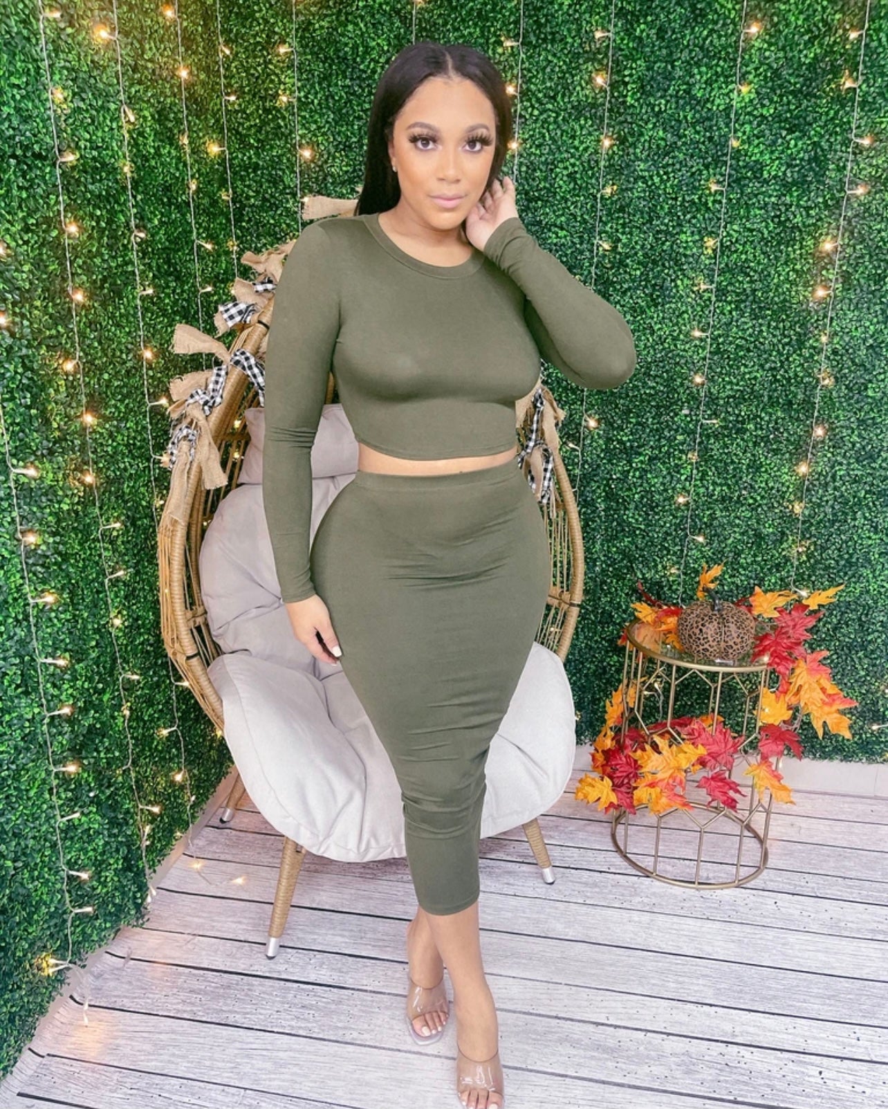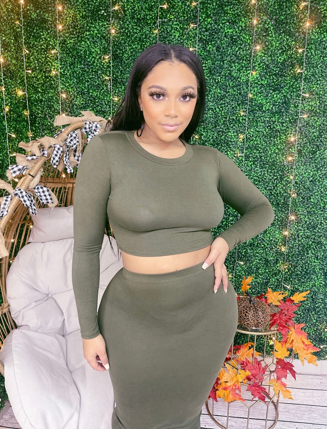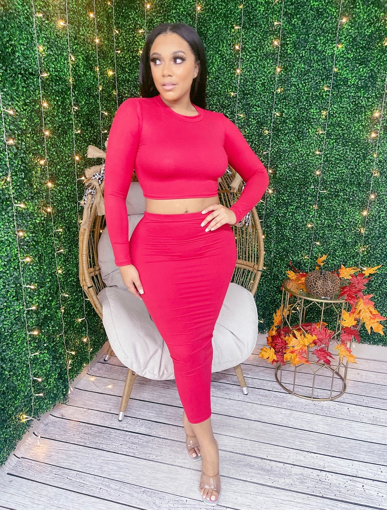 2 pc High waist skirt with long sleeve top, that perfect for a front knot or not! Rock it out your way.