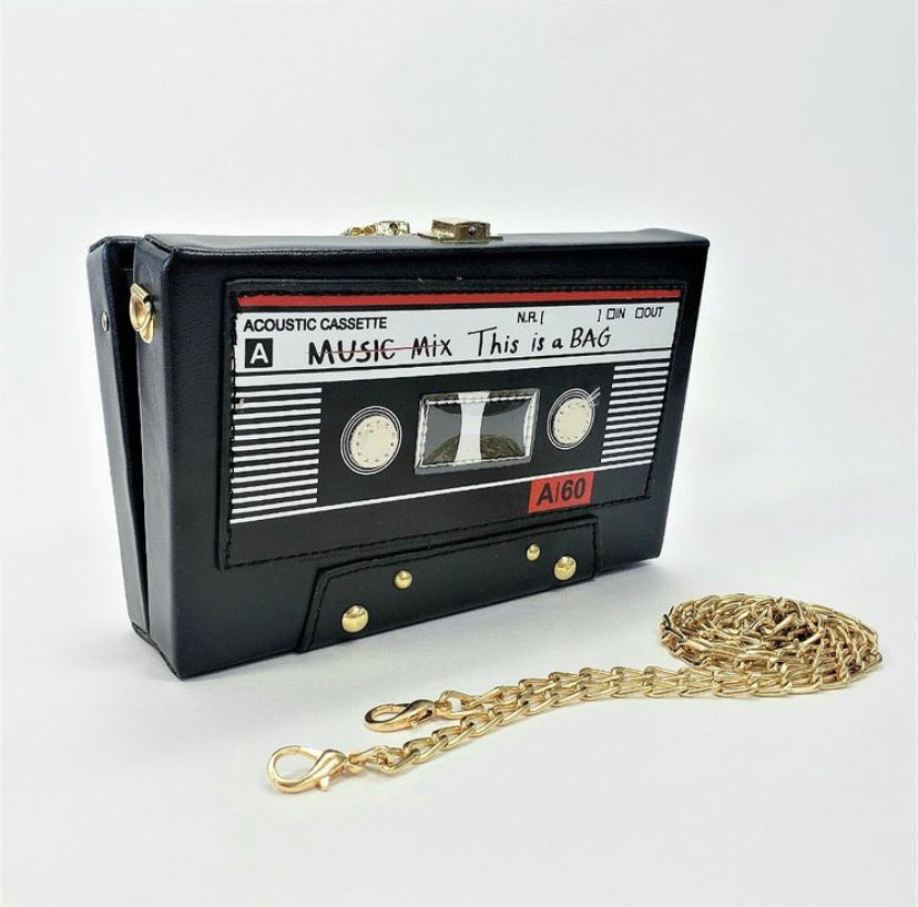 Cassette tape shaped purse, carry as a clutch or shoulder bag. Comes with straps