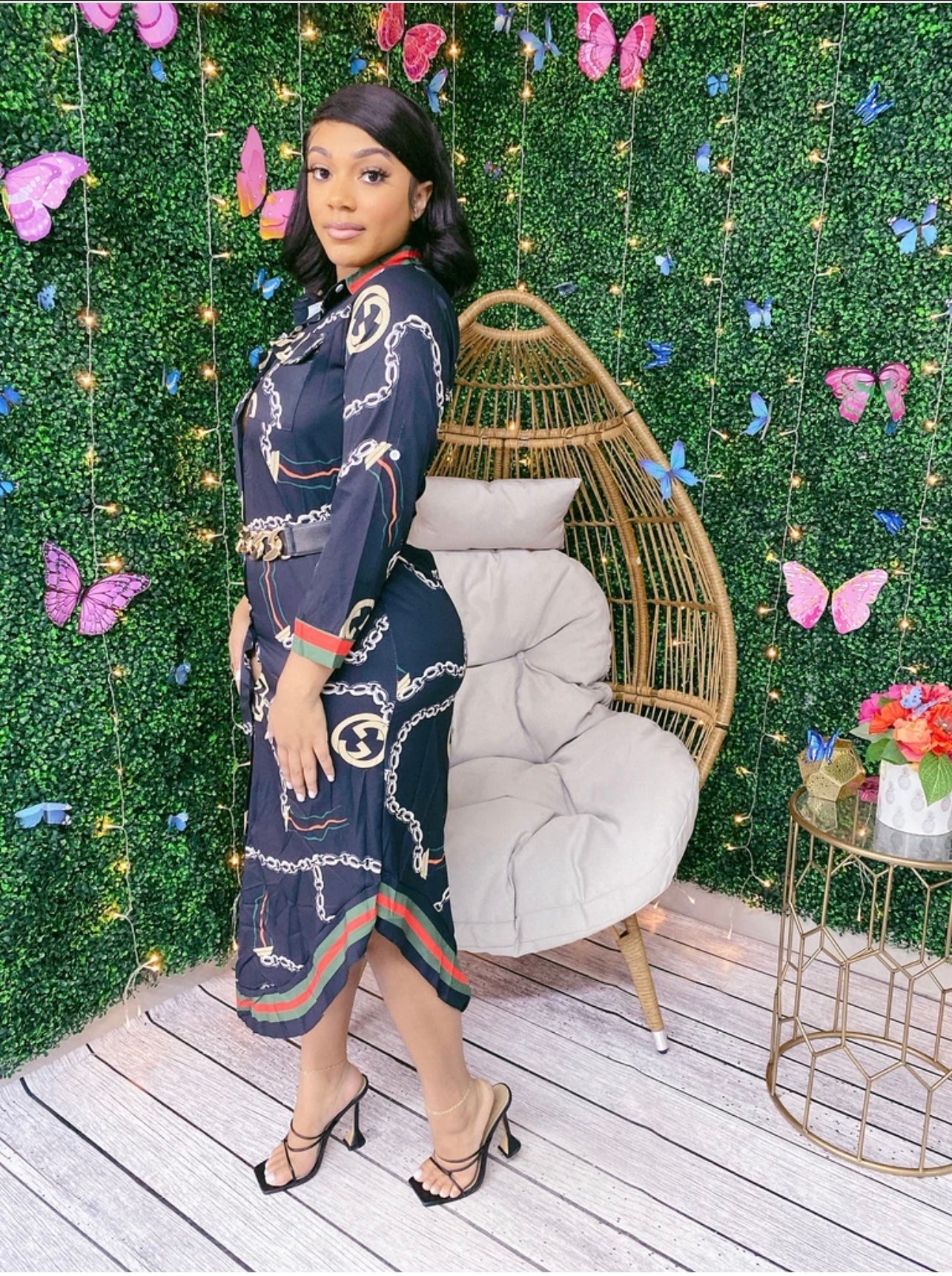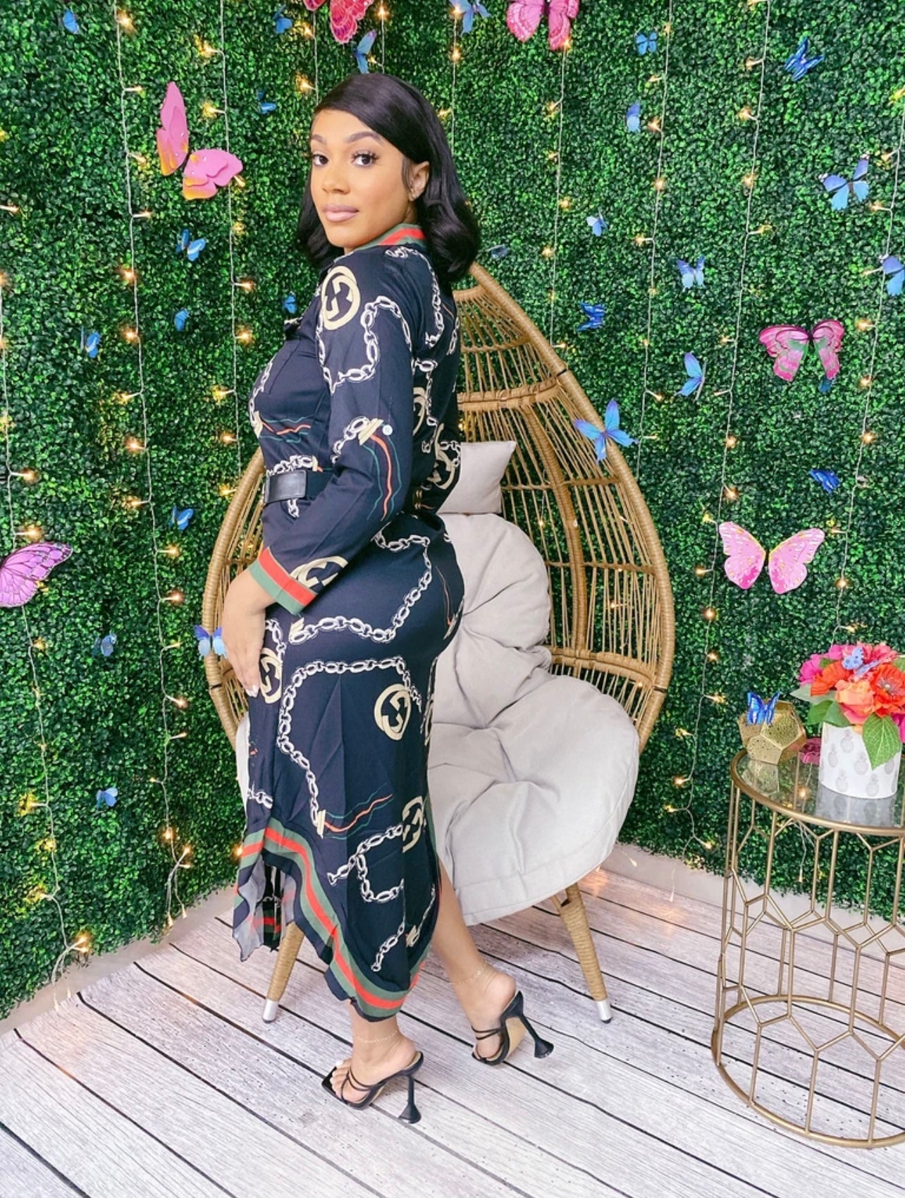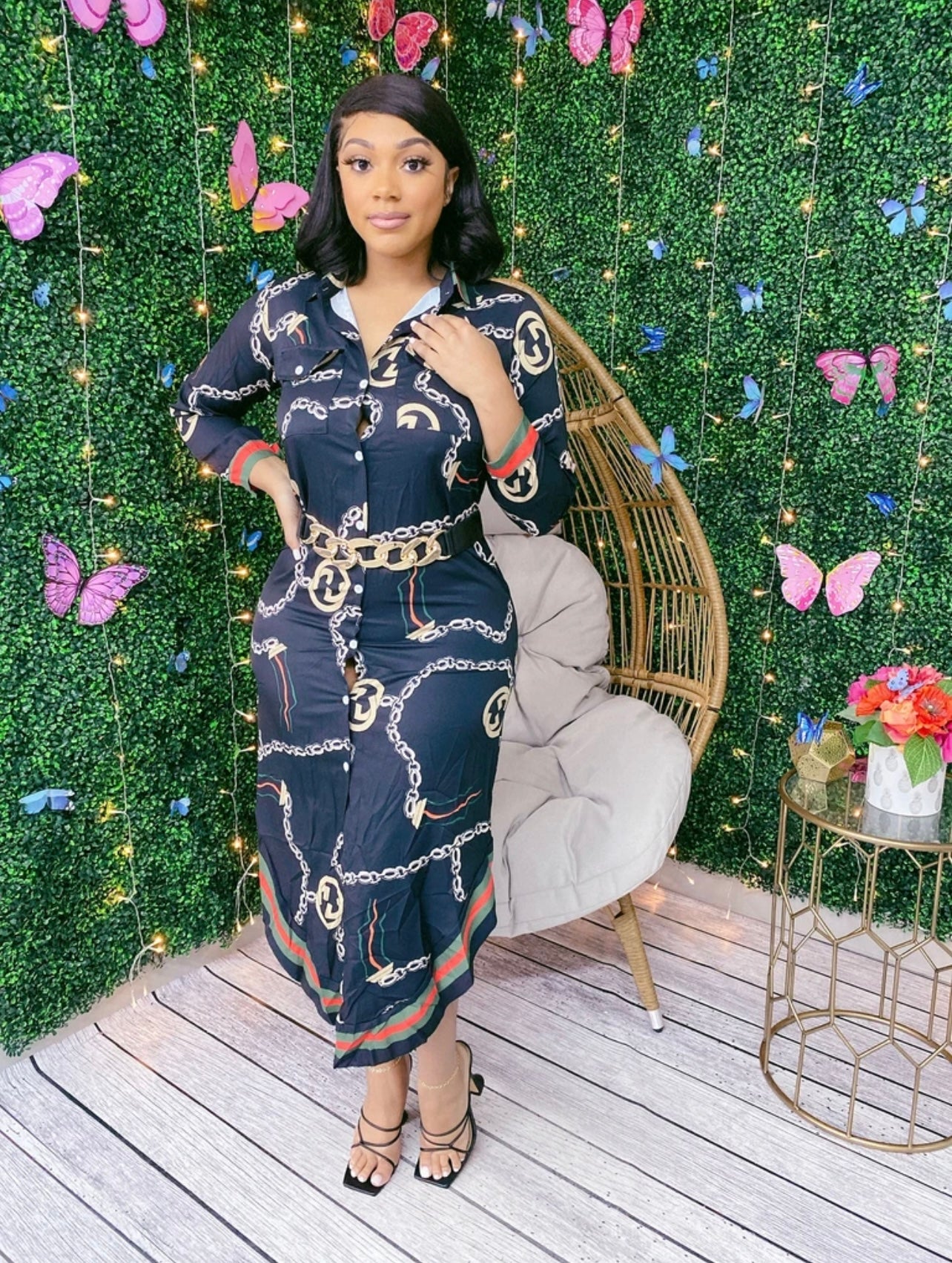 Print Button Long Dress- Black Chain Print