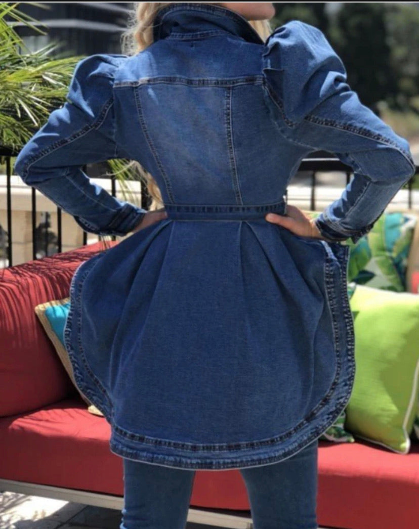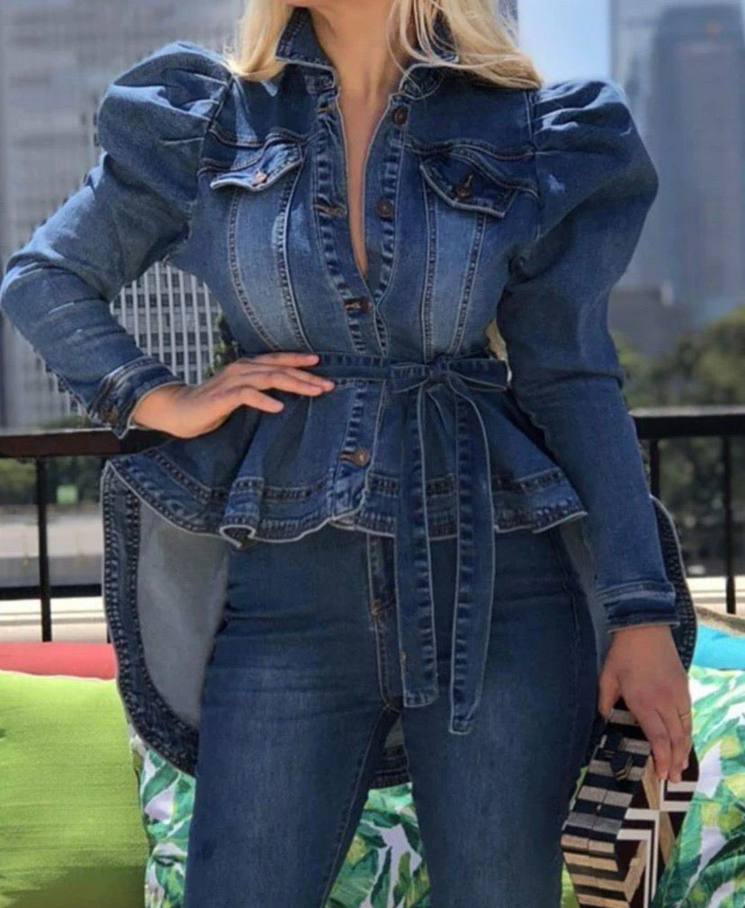 Denim Empire Shoulder, Hi-Lo Jacket With Belt.