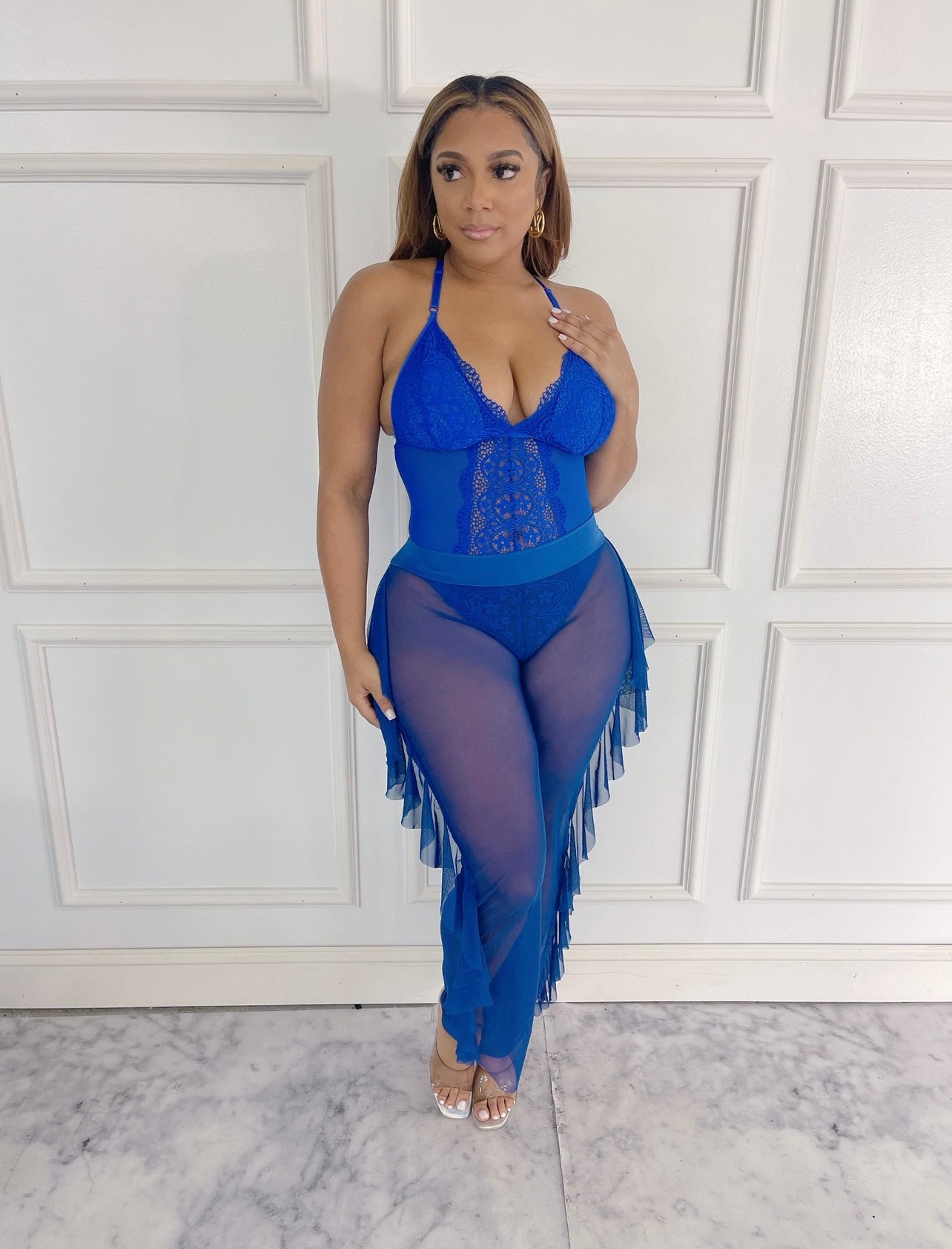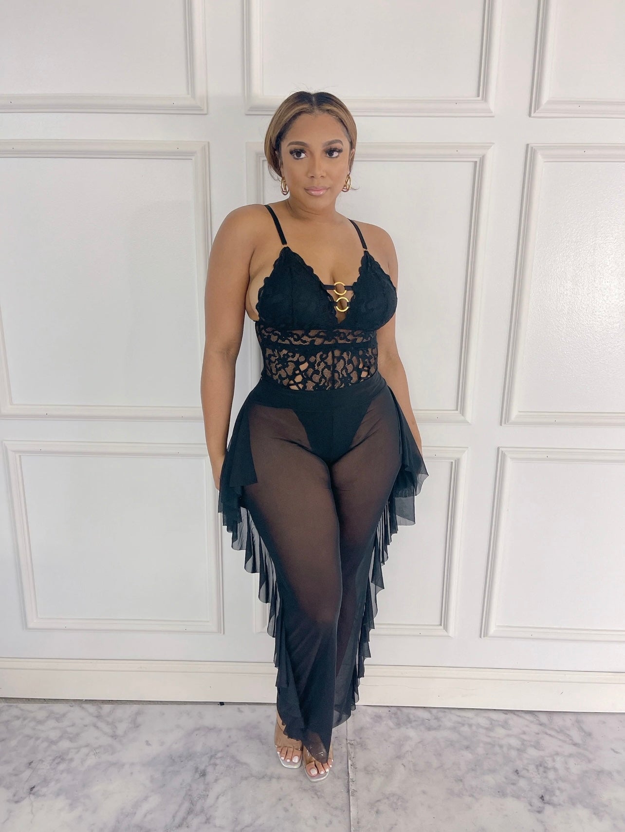 Mesh swimwear coverup pants with Fringe ruffles on the sides.