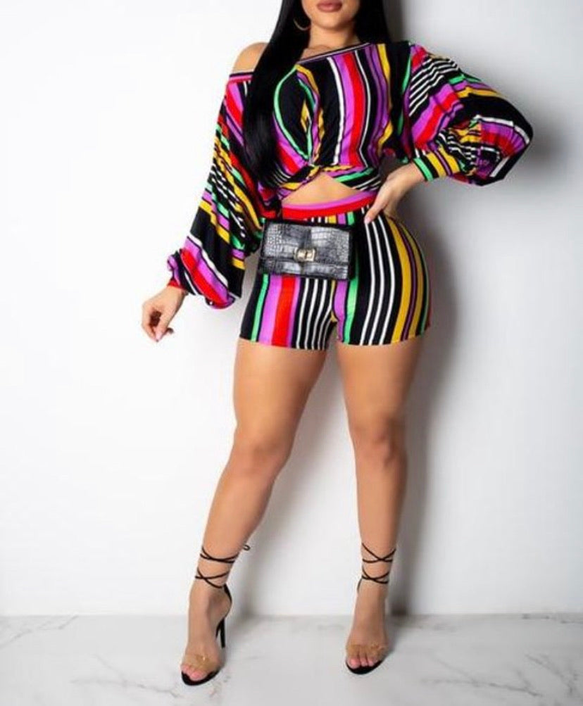 2 pc Multi colored shorts. Top has twist knot.