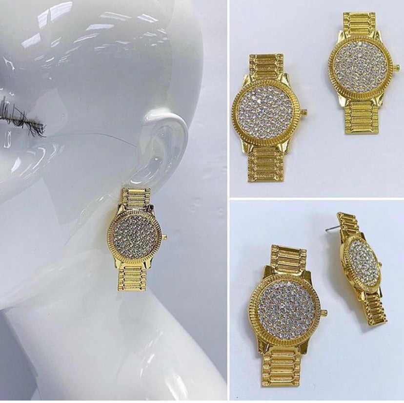 Gold and filled with rhinestones watch earrings